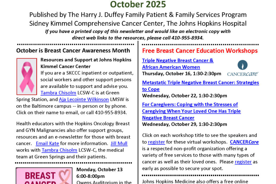 The Harry J Duffey Family Patient and Family Services Program at the Johns Hopkins Kimmel Cancer Center has compiled a list of events, activities, and… Read More »Living with Cancer Resources and Support – October 2025